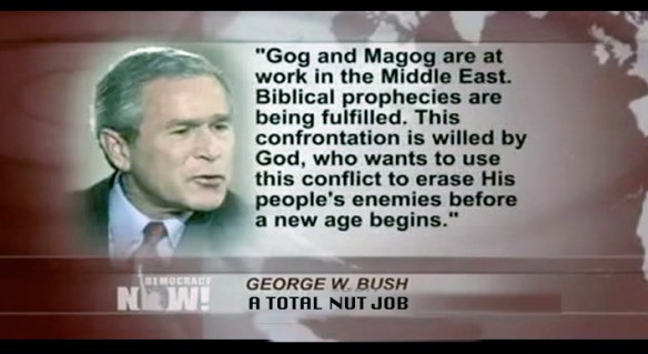 This made me very angry. I’m afraid to read the book! George Bush’s whacked out ideas about the end times and what was the result?