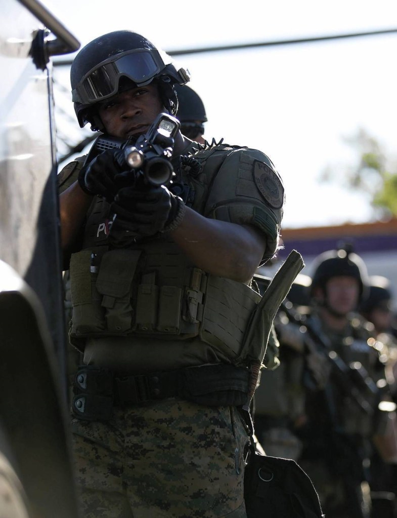 ORG XMIT: MA456 A police officer holds his riot gun while demonstrators protest the shooting death of teenager Michael Brown in Ferguson, Missouri August 13, 2014. Police in Ferguson fired several rounds of tear gas to disperse protesters late on Wednesday, on the fourth night of demonstrations over the fatal shooting last weekend of an unarmed black teenager Brown, 18, by a police officer on Saturday after what police said was a struggle with a gun in a police car. A witness in the case told local media that Brown had raised his arms to police to show that he was unarmed before being killed. REUTERS/Mario Anzuoni (UNITED STATES – Tags: CRIME LAW CIVIL UNREST)